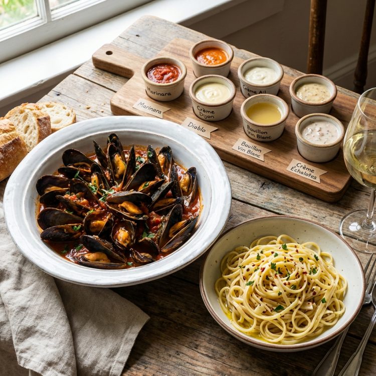 32,00$ Ingredients Moules avec 6 choix de sauces: marinara, diablo, crème, ail, crème dijon, bouillon vin blanc ou crème échalotes, servies avec linguini aglio e olio